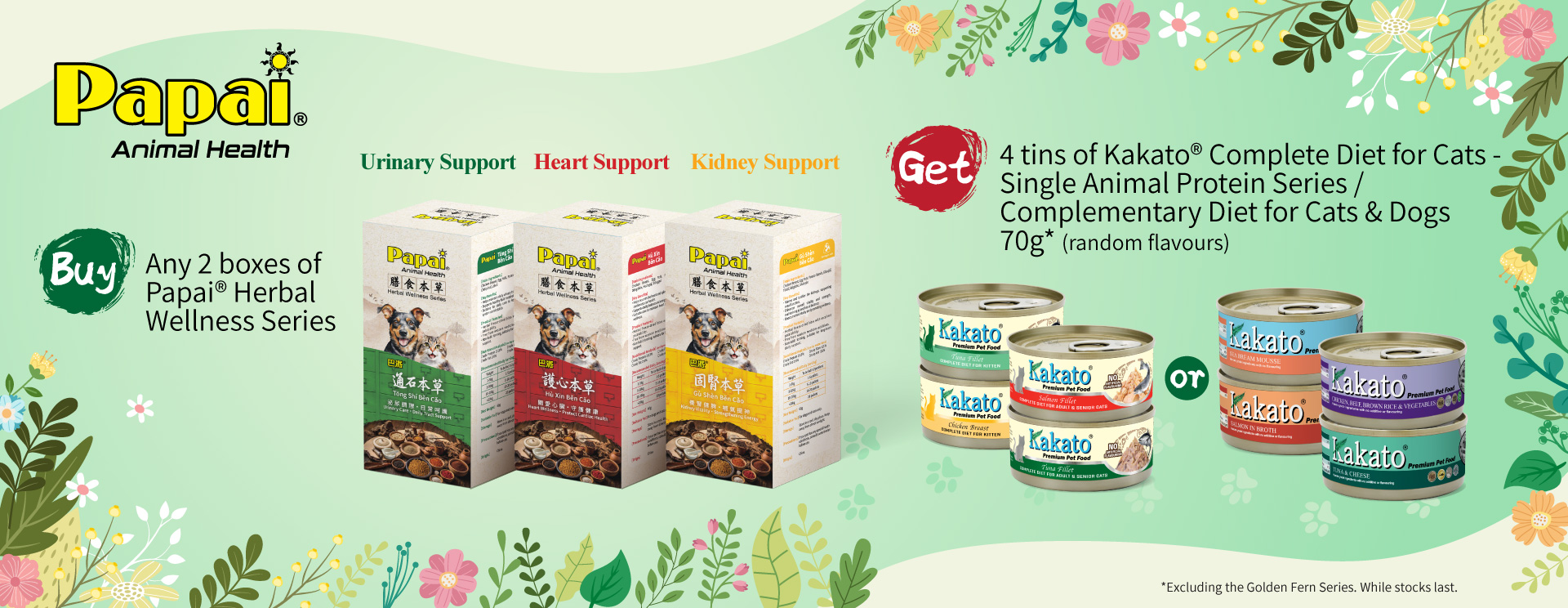 Buy 2 boxes of Papai® Herbal Wellness Series (any flavours), get 4 tins of Kakato® Complete Diet Tinned Food for Cats – Single Animal Protein Series / Complementary Diet 70g (random flavours) Excluding the Golden Fern Series. While stocks last.